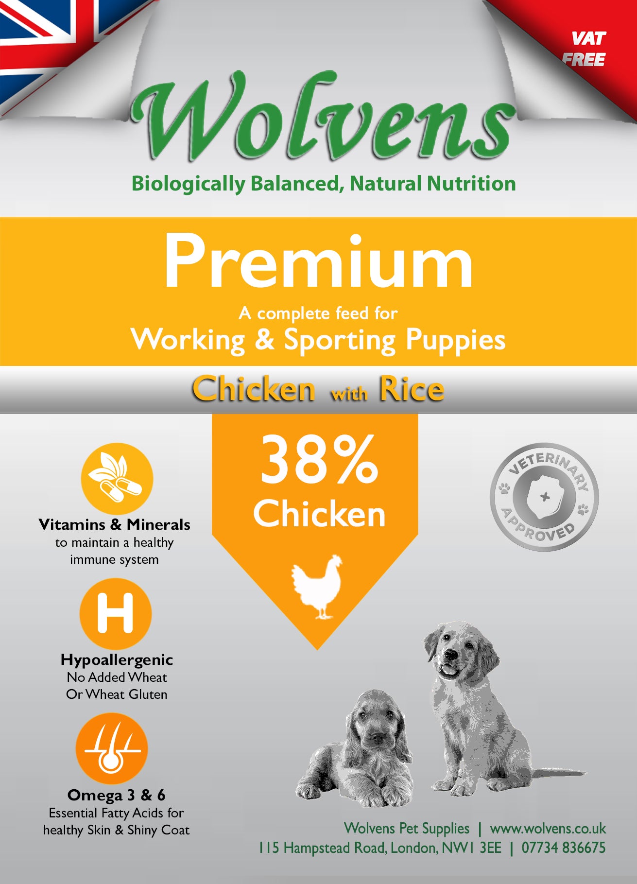 52% chicken and rice combination. Wolvens Premium Puppy food includes the highest quality ingredients. Hypoallergenic recipe that is free from wheat & wheat-gluten. It contains Oats - a slow-release source of energy as well Omega 3 and 6 to maintain a healthy coat and skin. VAT Free Sporting & Working Dog Food. Suitable for all Puppies and Junior Dogs