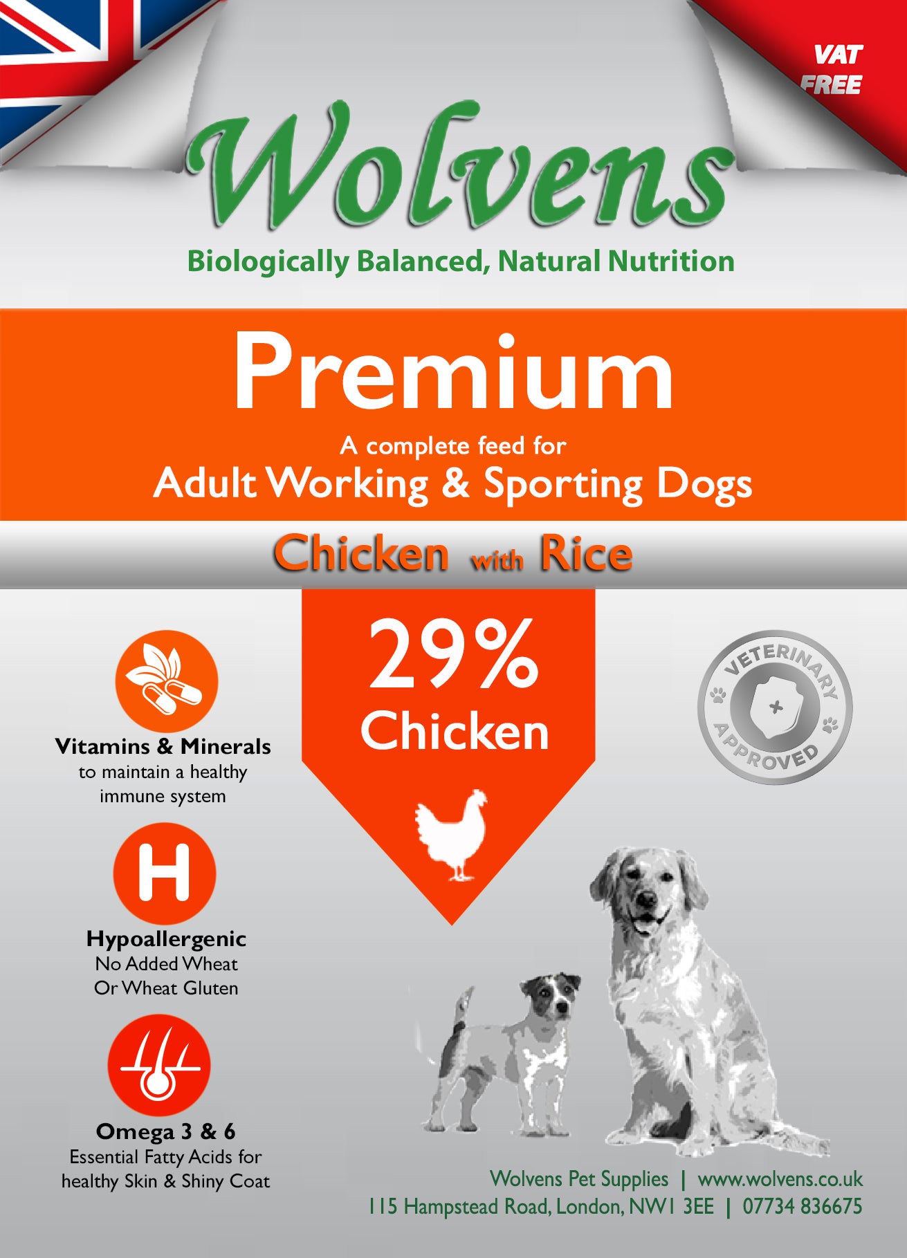 52% chicken and rice combination Wolvens Premium includes the highest quality ingredients.Hypoallergenic recipe that is free from wheat & wheat-gluten. It contains Oats - a slow-release source of energy as well Omega 3 and 6 to maintain a healthy coat and skin.